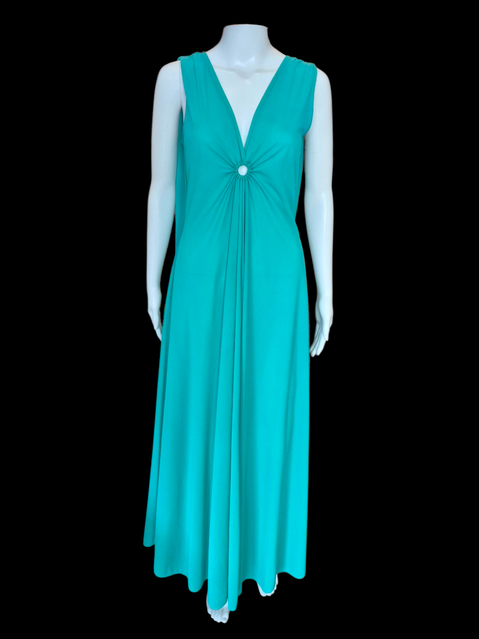 This amazing nightgown is the same color and style of the nightgown worn by Christina Hendricks character Joan in the iconic Mad Men! This opaque green nightgown features a deep V neck and back , a keyhole bodice and a beautiful flowing cape back. This would be perfect for a mad men themed party, or for lounging around waiting for Roger to call.