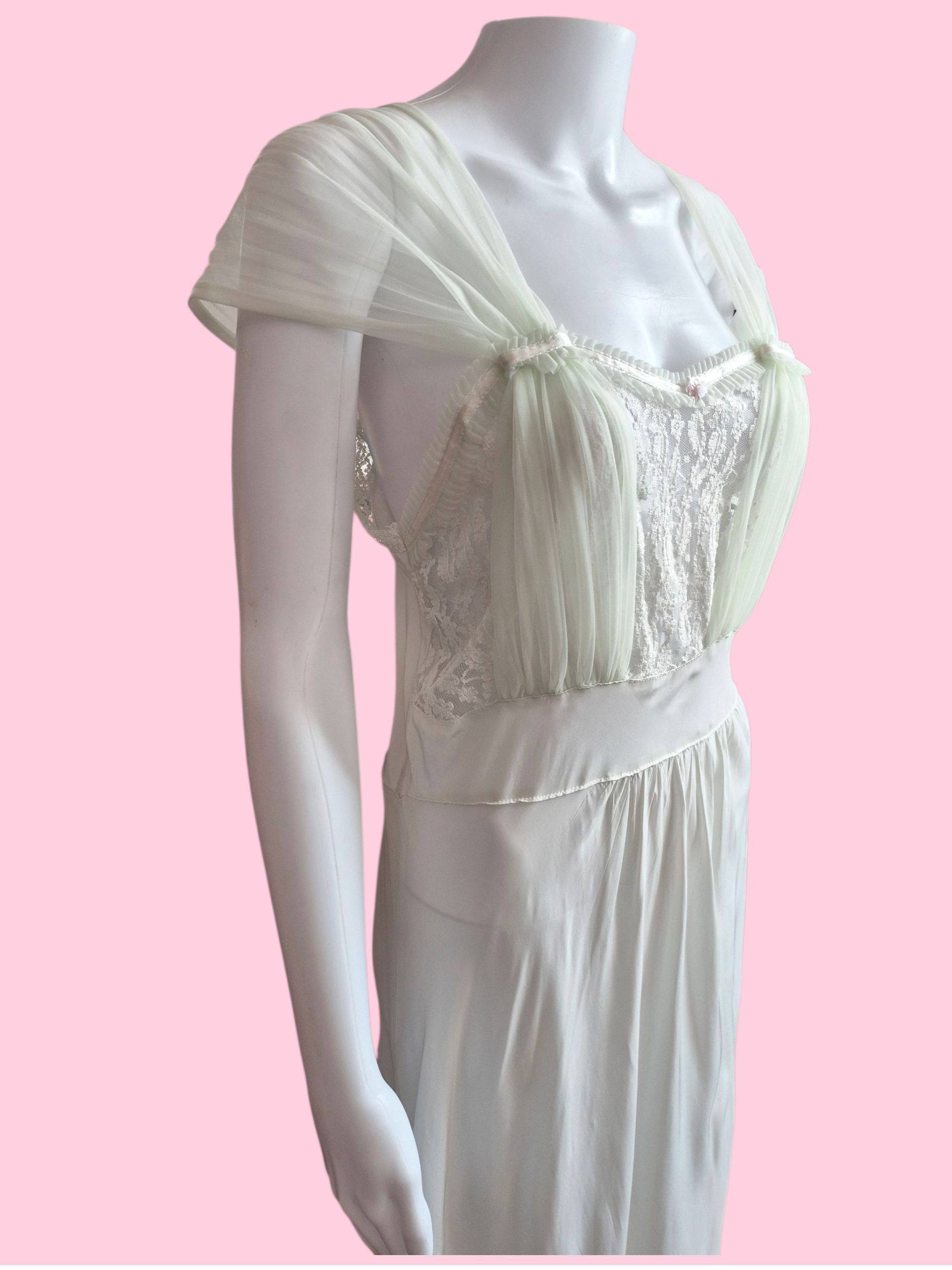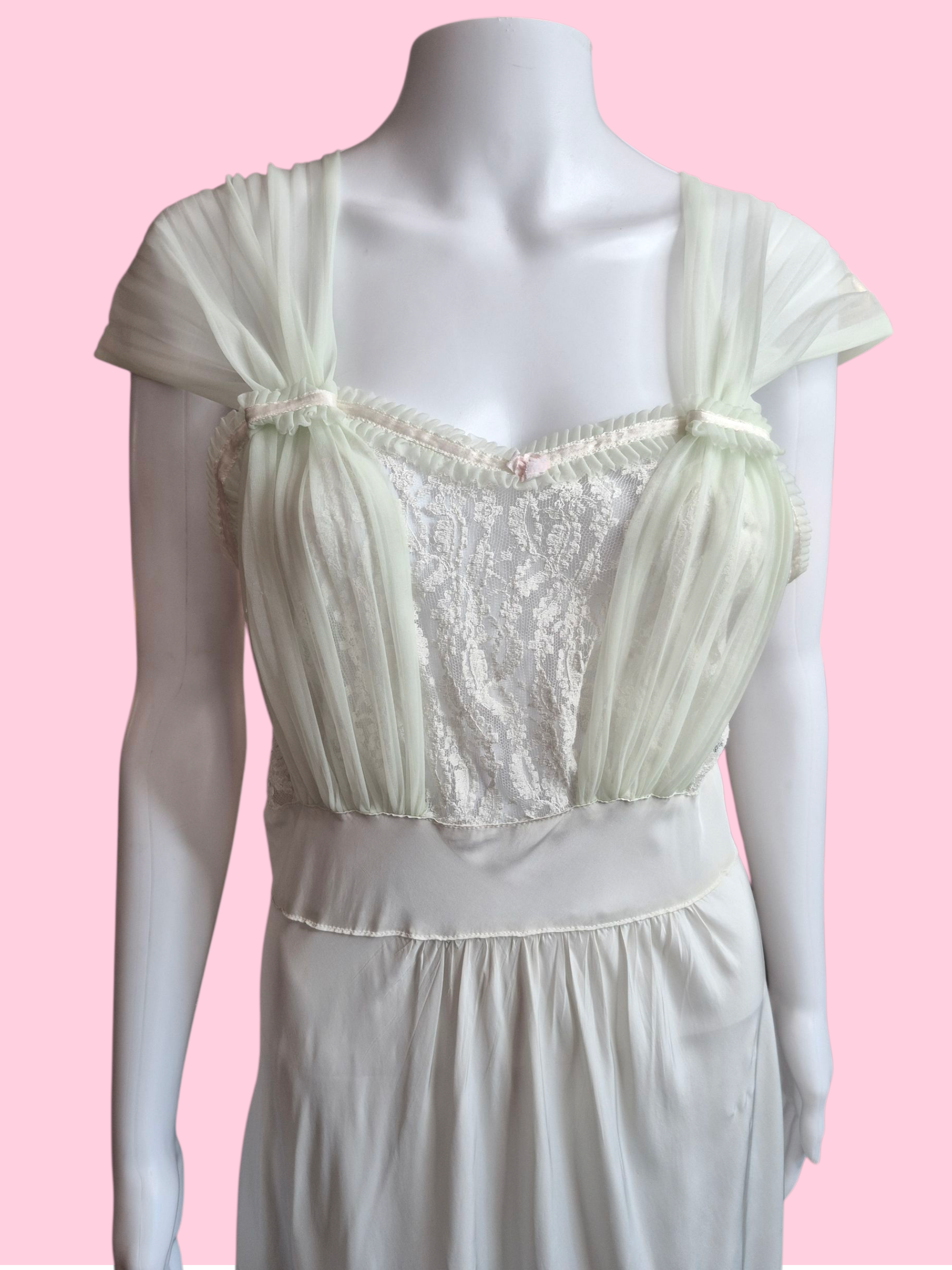 Vtg 1940s pale green negligee with sheer lace bodice size L