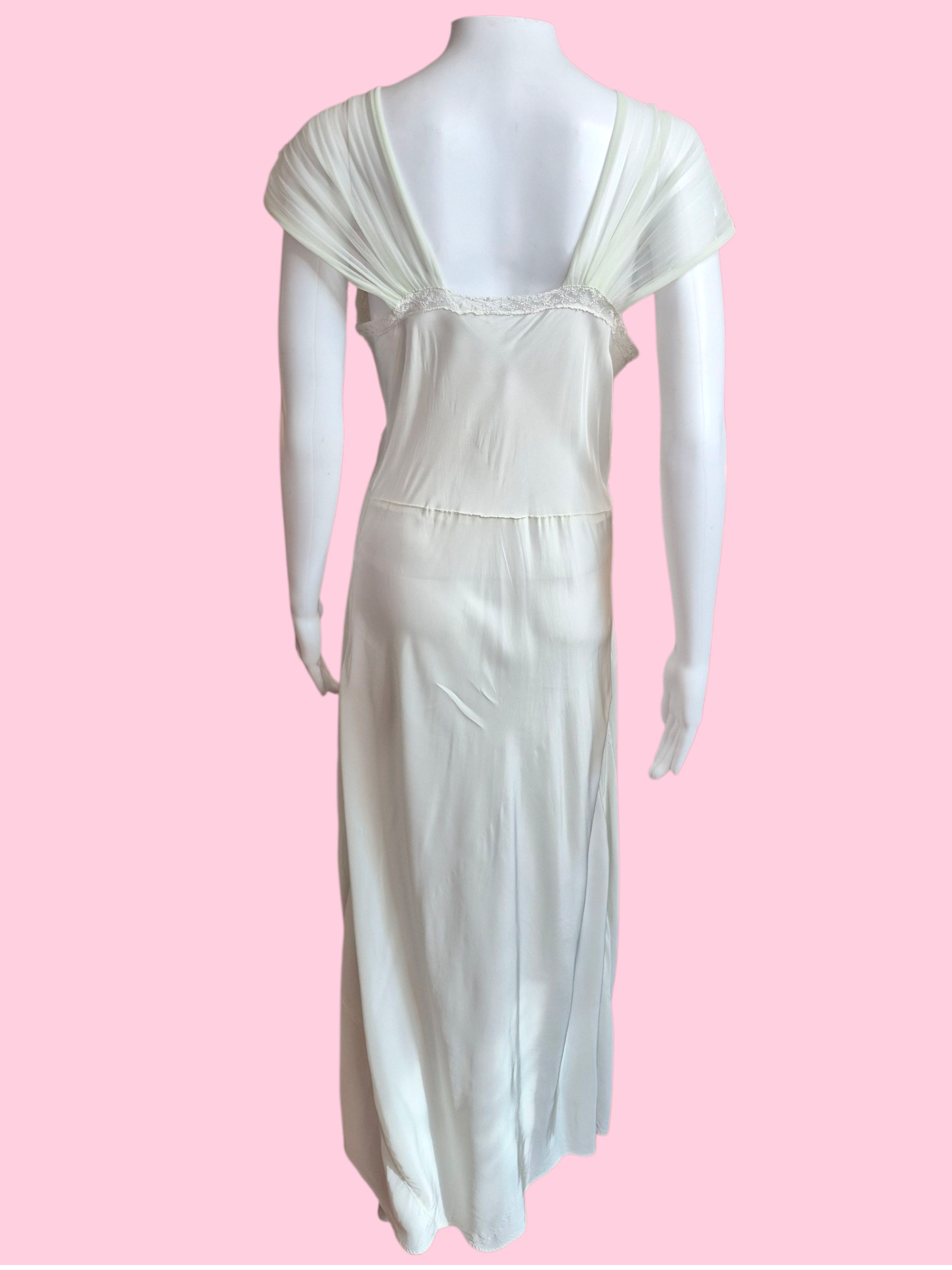 This incredible nightgown features a sheer lace bodice with pleated bust accents that drape over the arms to create a sleeve. A small pink bow accent decorates the sweetheart neckline, and the skirt is formed of a lightweight, bias cut rayon