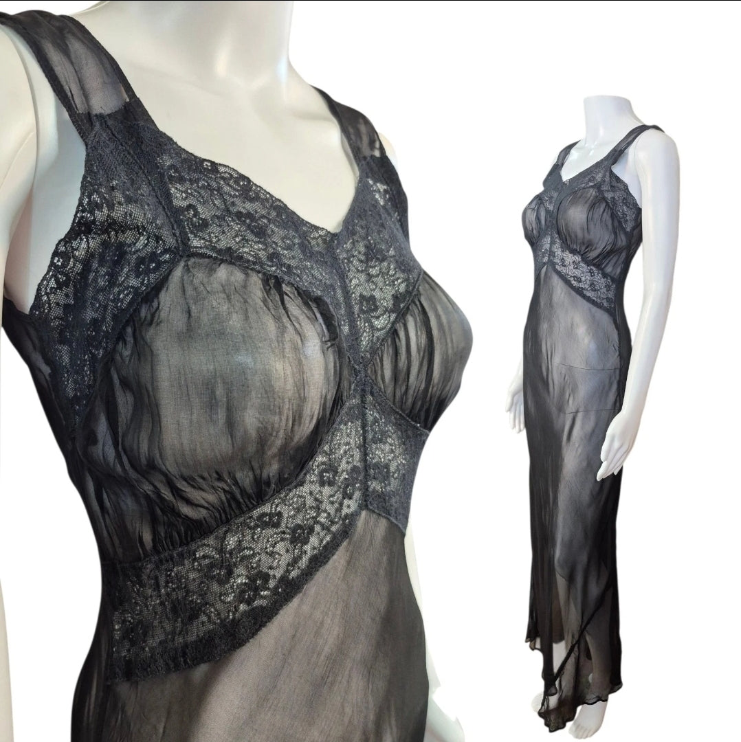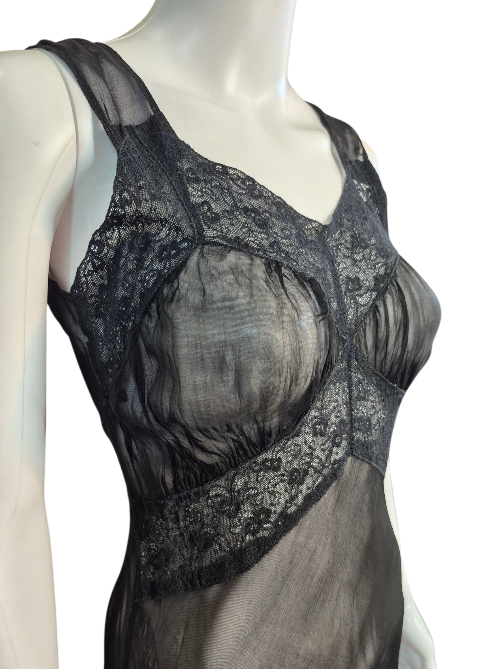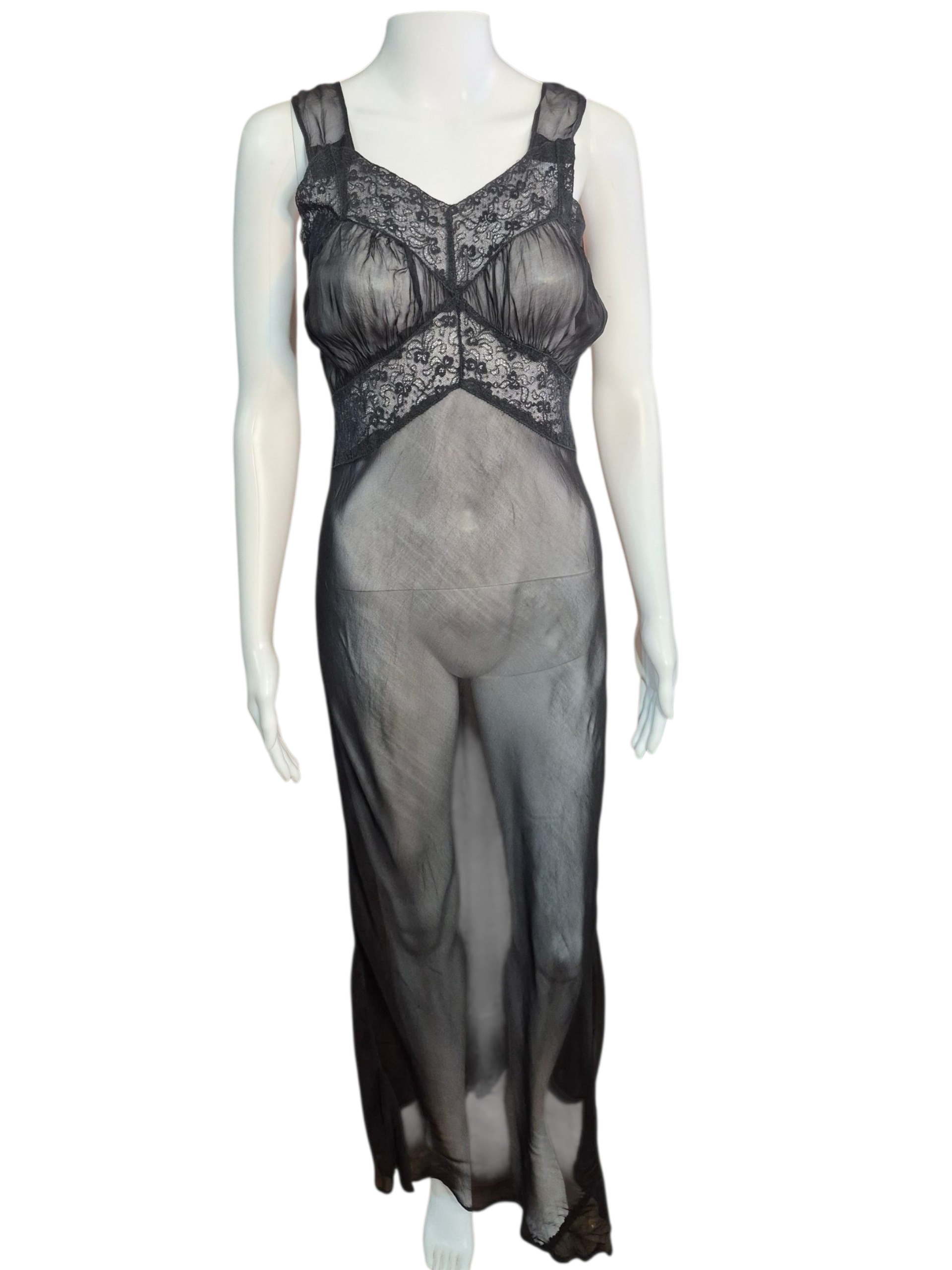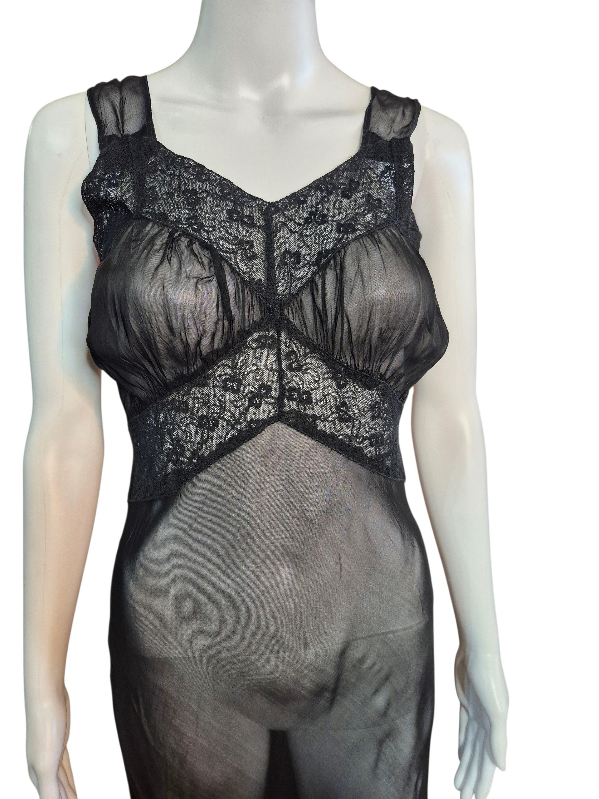 This extremely sexy,sheer black negligee is made of a bias cut black chiffon. It has gathered cups, as well as ornate lace trim on the bodice. Due to the bias cut, there is some give to the fabric and it can stretch to fit multiple sizes. Measurements given below are flat measurements and then stretched measurements.