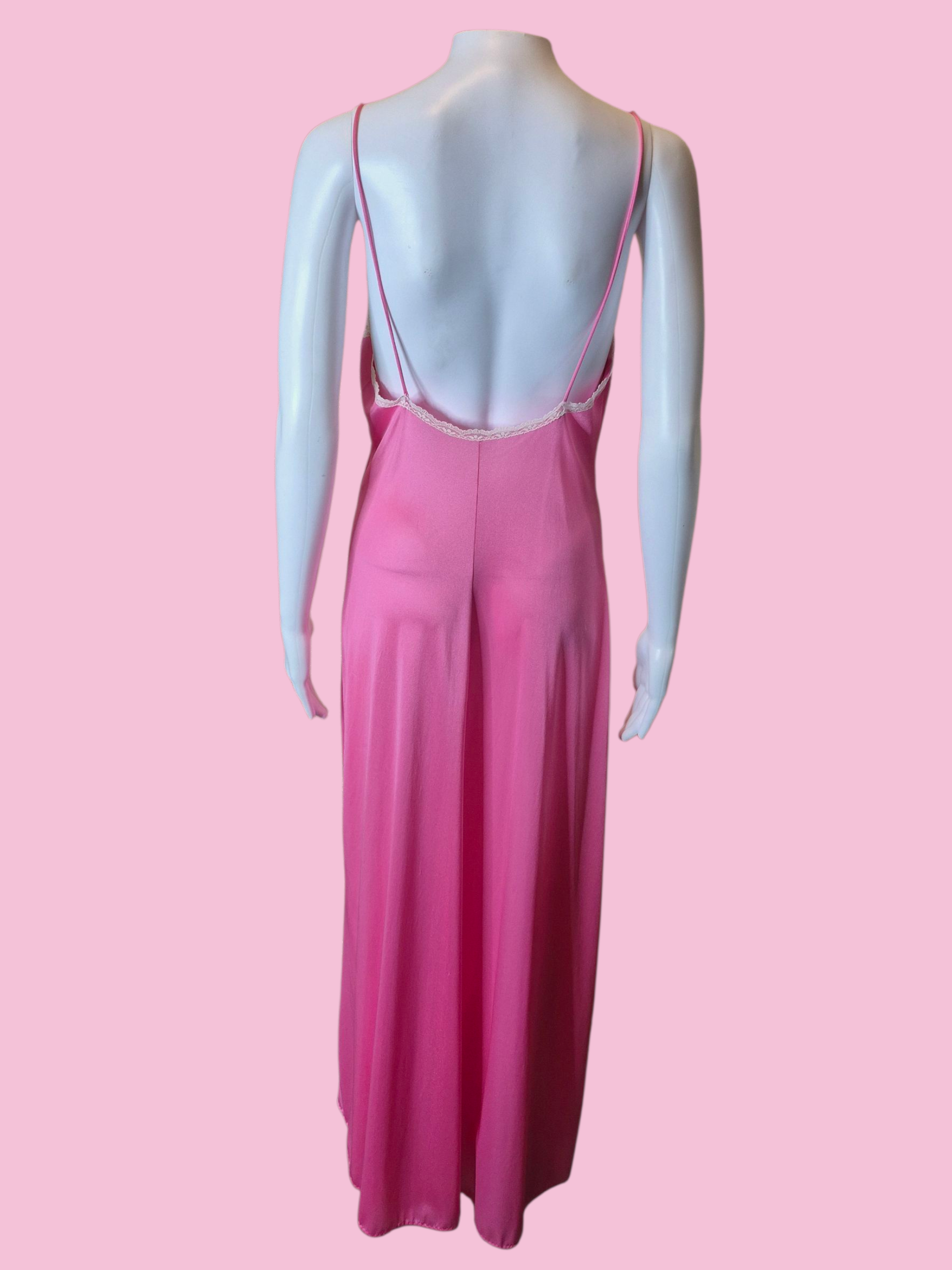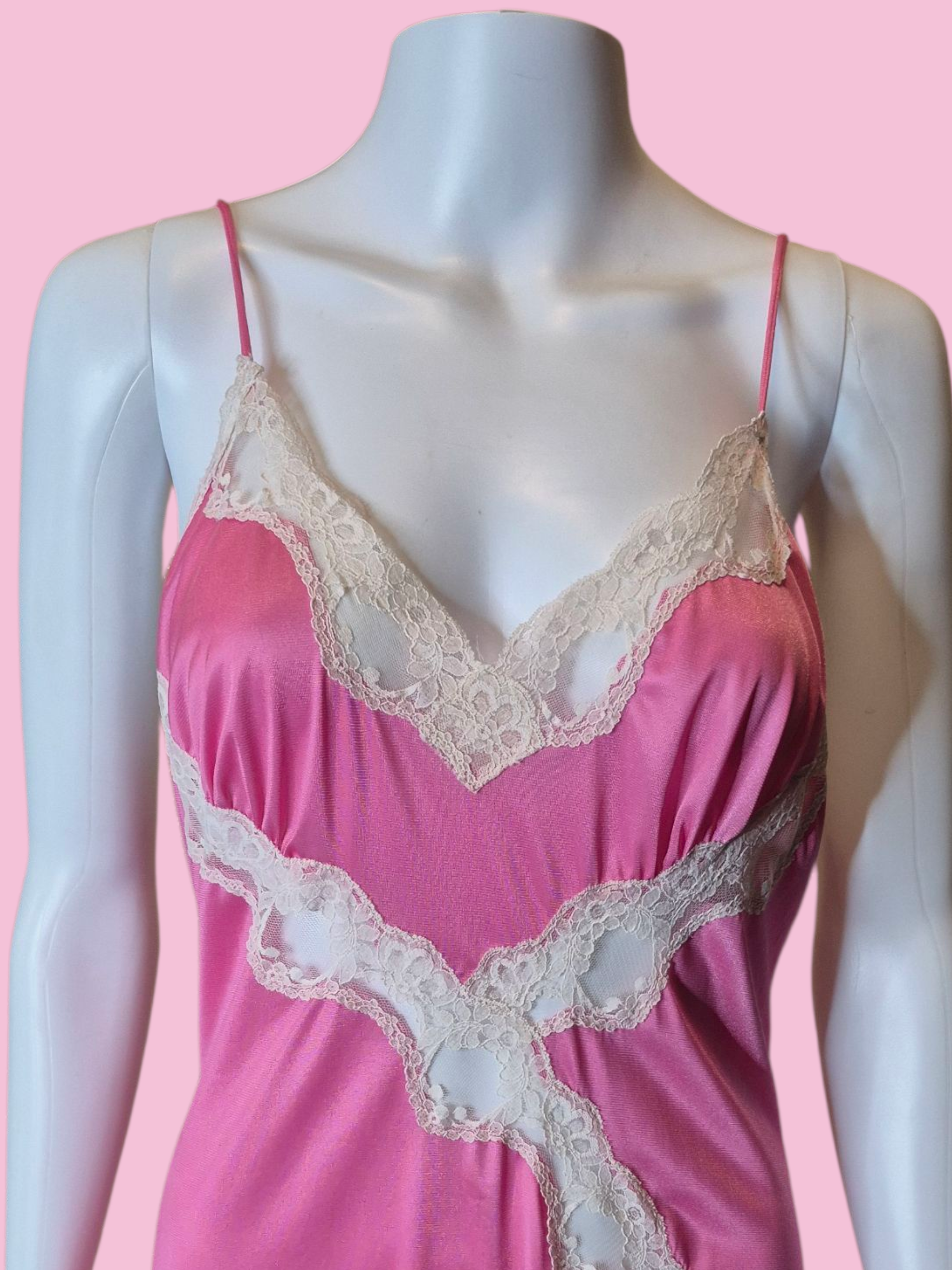 This gorgeous hot pink nightgown is from JCPenny circa 1963-74. It boasts asymmetrical sheer ivory lace bands, delicate spaghetti straps, and a sultry leg slit. Timeless elegance and sophisticated style embodied in one beautiful piece.
